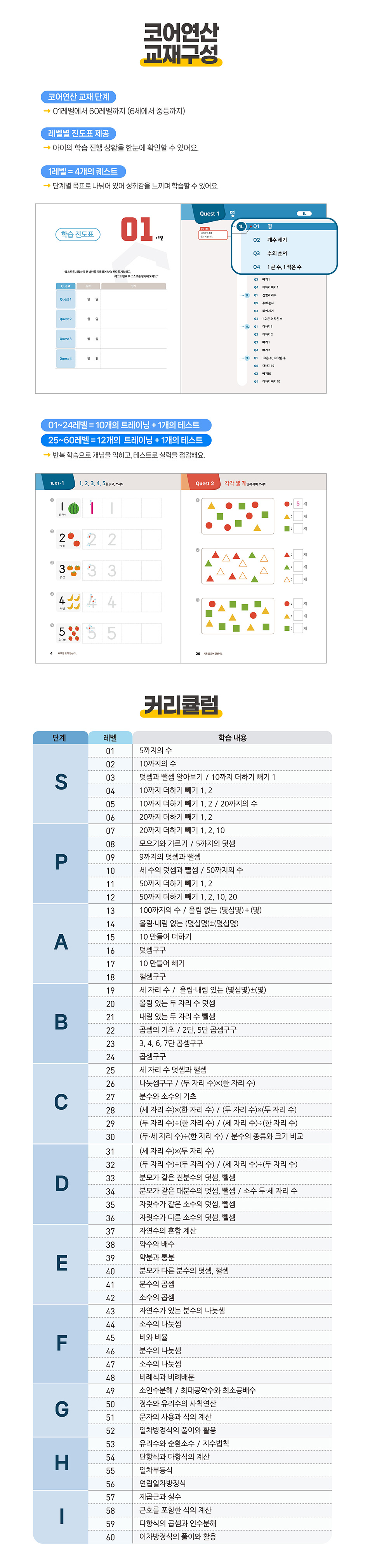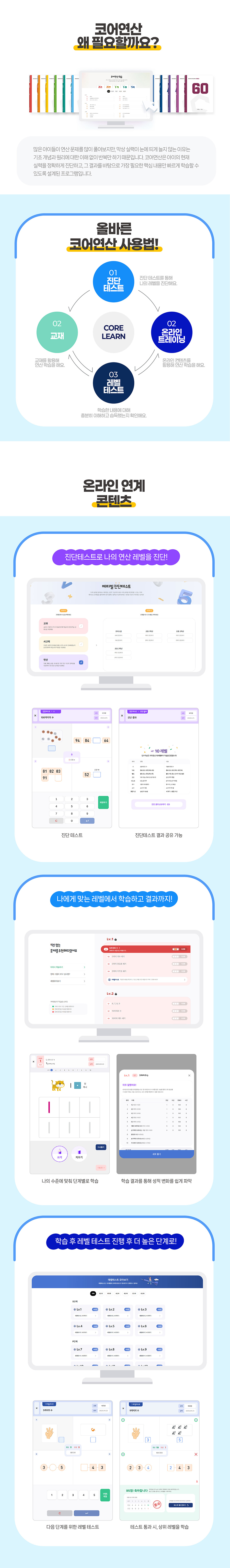 바르게 진단하고, 핵심만 빠르게! 이제 겉햝기식 연산 학습은 그만! 코어연산은 기초 개념부터 정확히 짚어주고, 반복 학습을 통해 연산 실력을 탄탄하게 다져줍니다. 또한 온라인 연계 콘텐츠로 언제 어디서든 편리하게 연산 학습을 할 수 있는 수학 프로그램입니다.